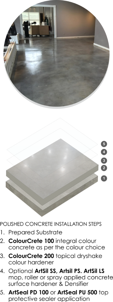 Polished Concrete, a sophisticated and sustainable flooring solution, transforms ordinary concrete slabs into stunning, high-performance finishes. Through a multi-step mechanical grinding and polishing process, combined with chemical hardeners and sealers, Polished Concrete achieves a smooth, highgloss surface that rivals natural stone or terrazzo. This technique enhances the aesthetic appeal by revealing concrete’s unique aggregate patterns and subtle nuances, while also improving its durability and longevity. Polished Concrete embodies modern design, offering a seamless, low-maintenance, and eco-friendly flooring option for both commercial and residential spaces, delivering a timeless look that is resilient and beautiful.
